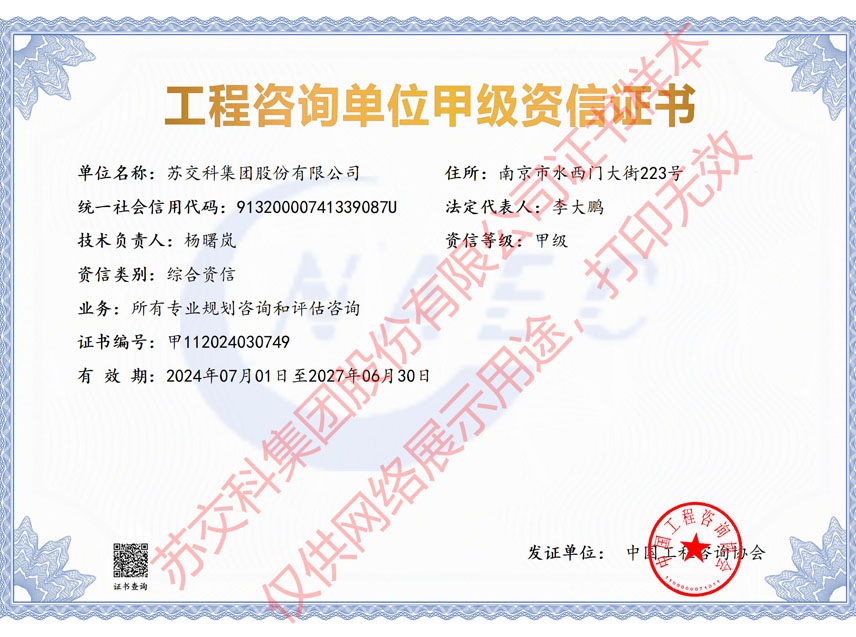 蘇交科擁有工程行業各領域甲級資質,包括城鄉規劃甲級資質;工程咨詢綜合甲級資質;工程咨詢專業甲級資質(公路、生態建設和環境工程、水文地質、工程測量、巖土工程、城市規劃、鐵路、城市軌道交通、港口河海工程、市政公用工程(市政交通、給排水)、水利工程、旅游工程);工程設計綜合甲級資質;工程勘察綜合類甲級資質;測繪甲級資質;公路工程和市政公用工程總承包一級資質;公路工程、水運工程、市政公用工程監理甲級資質;公路工程甲級、公路工程交通工程專項、水運工程材料甲級和水運工程結構甲級試驗檢測資質。