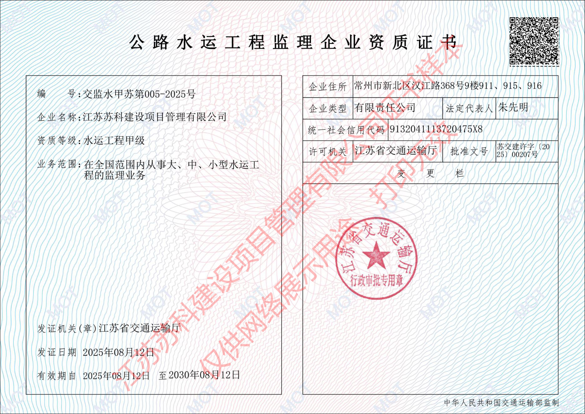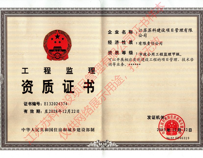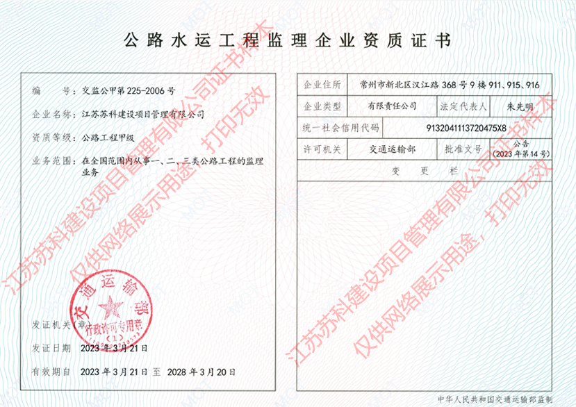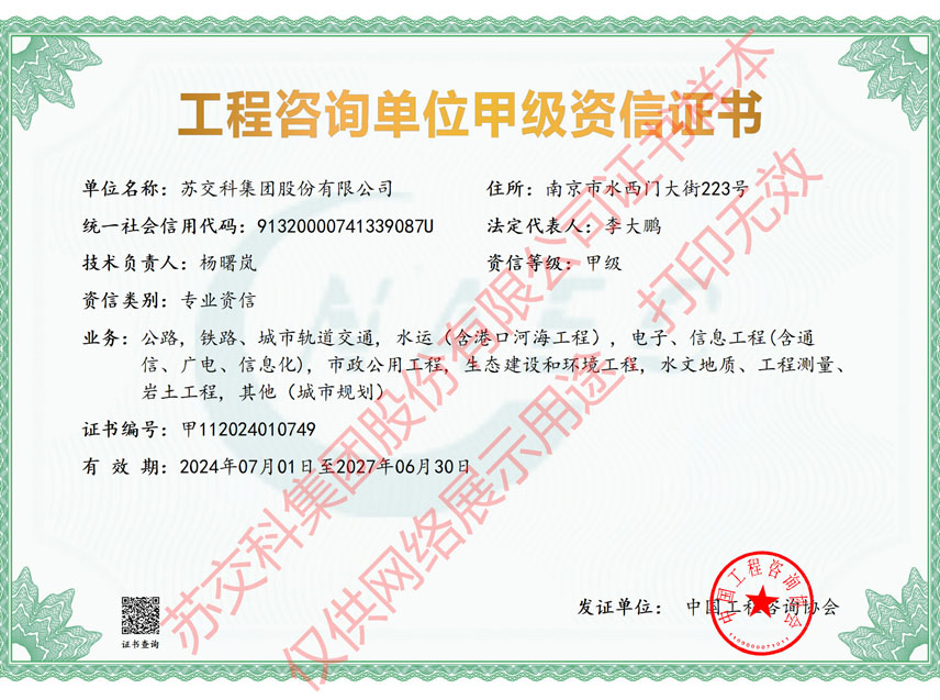 蘇科建設工程監理水運工程資質甲級